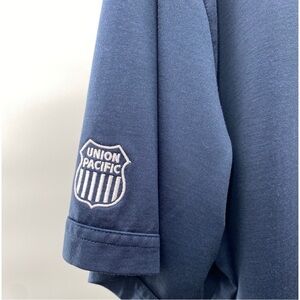 Dark navy Travis Mathew polo in XXL. Union Pacific embroidered logo on the left sleeve. Front left chest pocket. Travis Mathew logo on the back of the neck and slightly faded on the right side. Otherwise, great condition.