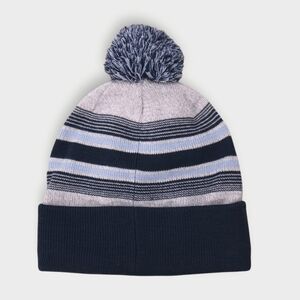 Stylish beanie featuring blue and gray stripes with a pom on top. Perfect for cold weather.