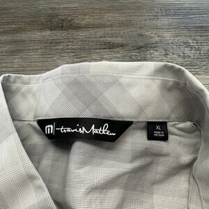 Travis Mathew Nylon Shirt Gray White Mens XL Plaid Short Sleeve Button Stretch golf Button-down, stretchy fabric. Lightweight Cotton/Spandex. Made in Vietnam. Comfy preppy golf performance