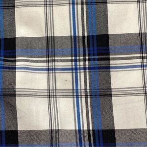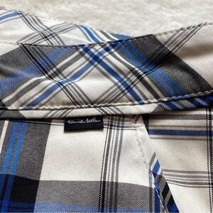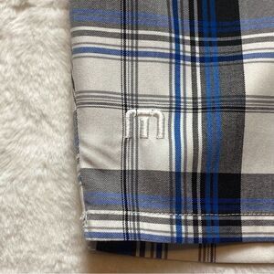 Travis Mathew Plaid White/Blue Golf Shorts Size 34. Great used condition. Button and zip front closure. 2 front and back pockets. One small spot on left and right legs, very faint, shown in photos. Measures waist 36”, inseam 10”, rise 11”.