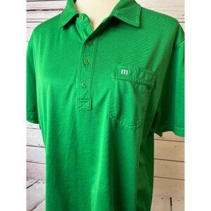 Travis Mathew Polo Golf Shirt Mens Large Green in color is perfect for the Irish Notre Dame St Patricks Day Lucky. Short sleeve pocket shirt. Slit on each side of shirt Extra button included. 60% Pima Cotton 40% Polyester. Machine washable. Rubber spell out logo across the back. Pit to pit 21.5", back bottom of collar to bottom of shirt 29". Great preowned condition with no rips or stains. perfect for the outdoors active fitness workout golf pickleball tennis player.