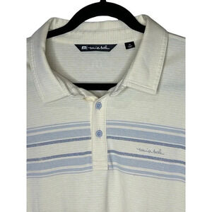 Travis Mathew polo shirt. Men’s XL in a light yellow with light blue stripes across the chest and 3 light blue buttons. Measurements: length(from bottom of collar to bottom hem)- 30 1/2 inches, sleeve( middle collar to end of sleeve)- 20 inches and underarm to underarm (chest)- 23 inches. Beautiful condition.