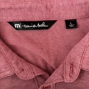 Travis Mathew golf polo in Size Large. Red and white micro striped. Preowned, no flaws.