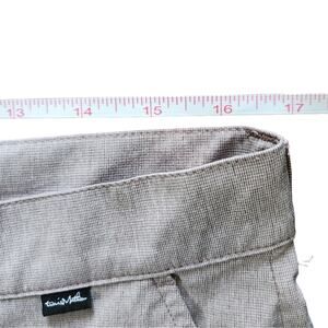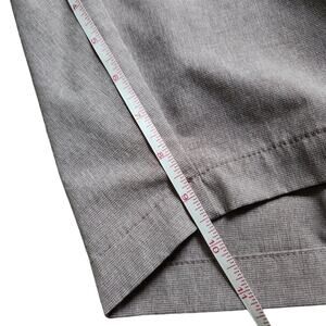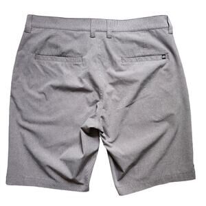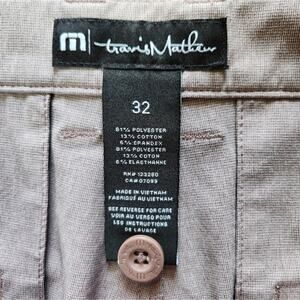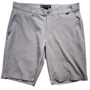 Travis Mathew men's golf shorts size 32 in a subtle graph check. Muted pink/rose background, white lines. Excellent pre-owned condition. Measurements in photos.