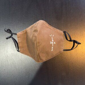 Brown cotton face mask featuring the iconic white vertical "Cactus Jack" logo on the left cheek. Designed with a structured front seam for a secure, form-fitting shape. Adjustable black elastic ear loops with toggles ensure a comfortable, customizable fit. Slight wear is visible near the upper edge, but overall in good condition. A must-have for fans of Travis Scott and collectors of Cactus Jack merchandise.