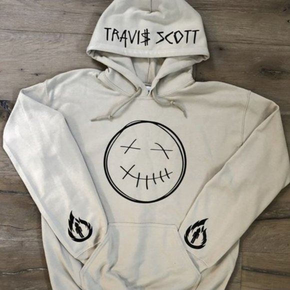 This is the Travis Scott Hoodie with Smile Design on the Front and La Flame Design on the Sleeves with Name on the Hood on a Sand Colored Hoodie with Black Designs.