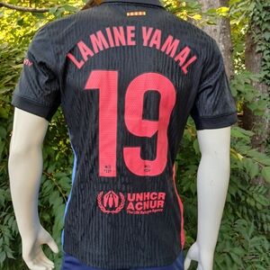 Featuring a predominantly black colorway, the jersey is adorned with subtle yet distinctive details that set it apart from traditional football kits. The Cactus Jack logo is prominently displayed, seamlessly blending with FC Barcelona's iconic crest and sponsor logos. This collaboration represents a fusion of music, sports, and fashion, embodying the global appeal of both Travis Scott and FC Barcelona.