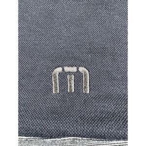 Travis Mathew Blocked Striped Polo Shirt. Size large. In good condition. 1/4 button neck. Blue top with striped gray section below it. Slits on the lower sides. M logo on the left chest and logo on the upper back.