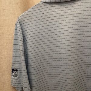 TravisMathew Men’s Polo Shirt Golf Large Light Blue Striped Marlin Logo