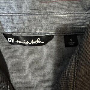 Logos: Embroidered "m" logo at left chest; script "travisMathew" at back yoke