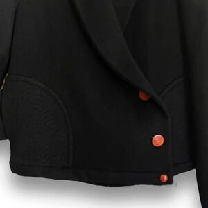 Travota Wool Blend Embroidered Black Waist Coat Jacket With Quilted Lining Size Medium. Features: Front pockets and one inside pocket, shawl collar, button front closure, embroidered side pockets and back yoke. This jacket was beautifully crafted! Wool/Viscose blend with a Poly quilted lining (fully lined). Approximate measurements: armpit to armpit 18.5”, length 21”. In excellent condition! No fading, no pilling, no stains!