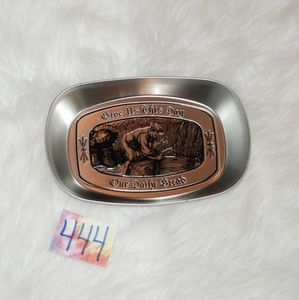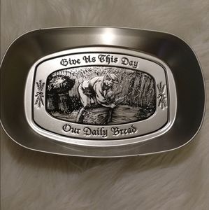 Silver colored decorative tray. I actually have one just like it and we mounted on the wall in the kitchen. Reads " Give Us This Day Our Daily Bread " not recommended for microwave or dishwasher. Like new condition. MEASUREMENTS approx: Width 6.5 inches, Length almost 10 inches