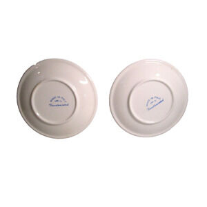 The saucers measure 7.5 inches. Colors are blue and green with a white center. Smooth surface with a slight dip to hold a cup. Stamped in blue on the back are: