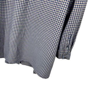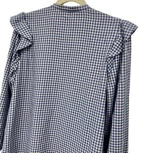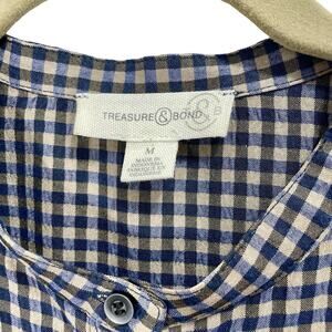 Compare measurements to a similar item of clothing you own to ensure fit before purchasing. Previous washing may change the sizing. Please review the measurements in description to ensure proper fit. This Treasure & Bond dress features a blue and gray plaid pattern with button-up long sleeves and a charming babydoll style with ruffle accents. It's a delightful addition to any wardrobe!