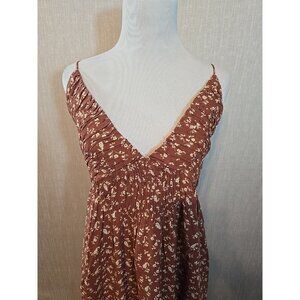The Treasure & Bond Brown Mahogany Little Paris cotton halter maxi dress in size XL is a stylish and versatile piece perfect for casual occasions. This sleeveless dress features a beautiful floral pattern, a halter neckline with a tie closure, and strappy sleeves for a comfortable fit. Made from 100% cotton, this lightweight and stretchy dress is ideal for summer, fall, and spring seasons. With a bohemian and classic Parisian theme, this dress is a sexy and feminine choice that will surely make a statement.