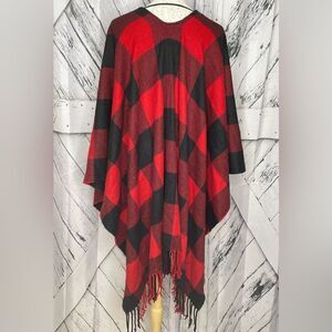 Red and black large buffalo check open front poncho with fringe along the bottom.