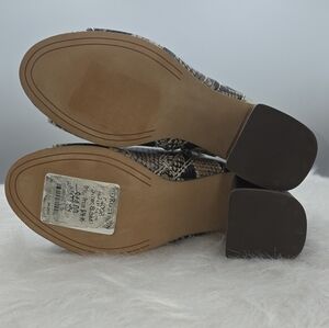 Treasure & Bond Hayley Block Heel Sandals with a snakeskin print. Appear to have never been worn. These sandals feature a peep toe, a 4" high block heel, and a slingback style with a side zipper