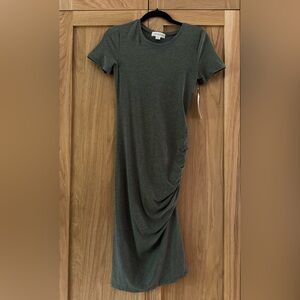 This tshirt sheath dress in a heathered green hue features a scoop neckline and a sleek, form-fitting silhouette. Perfect for casual or work settings, its midi length and minimalistic design make it a versatile wardrobe staple.