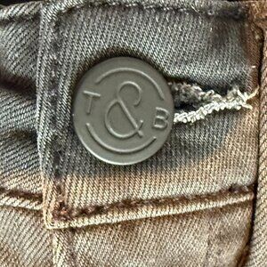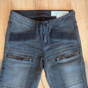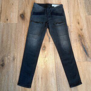 Stylized front pockets complete with paneled trim and zippered detailing, lend moto spirit to skinny ankle jeans in a hand-sanded charcoal wash. Stretch denim delivers lightweight comfort with a soft feel. Zip fly with button closure. Signature Treasure & Bond logos on button and labeling. Size 25. Like new - worn 1 time.