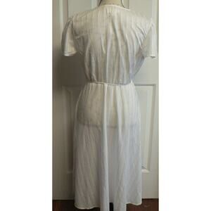 Simple and classic, this all-white midi dress styled in a true wrap silhouette is easy to accessorize for any look you'd like. Light enough for Beach Cover-up.