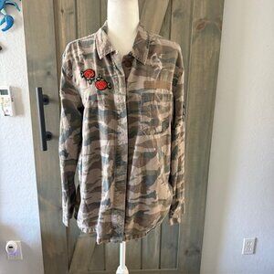Treasure & Bond Womens L Boyfriend Fit Button-up Shirt Camo Embroidered Patches