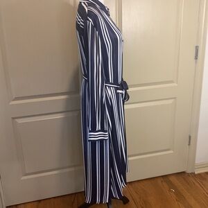 Treasure and Bond long shirt dress with coordinating belt. Size medium. Vertical stripes to elongate the silhouette. 100% viscose but it feels like silk. 21 inches from pit to pit and 49 inches in length.