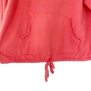 Treasure & Bond Women's Sweatshirt Tie Waist Raglan in Orange Stonewashed with Raglan sleeves, wide sleeves, drawstring at bottom hem, kangaroo pocket on front, long sleeve, slight scoop neck, oversized and off the shoulder sweatshirt with cut off effect neckline.