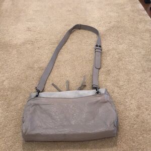 Treasure and Bond suede and leather cross body. It’s a light gray two-tone purse with suede and leather. purse. Width is 12 inches
