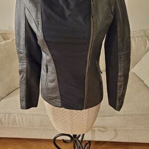 100% leather with 95% viscose, 5% spandex front and 59% polyester, 39% cotton, 2% spandex ribbed inner sleeves