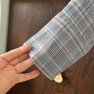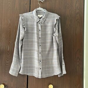 Treasure & Bond blouse in gray, black and navy plaid blouse. Ruffle at the shoulders. Boho vibe cuff on the long sleeves. V panels at the sides. Size Small.