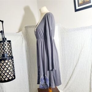 Gray midi, wide v-neckline, long sleeves dress. Stretchy waist. Rock abstract print detail with studs. Pre-owned but never worn. It's just been stored for a while. Great condition. Please refer to pictures for best description and condition verification.