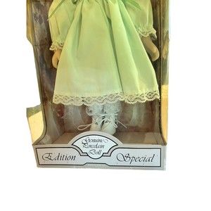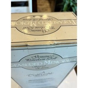 Treasured Memories Young Friends Collection by Adorable Memories Porcelain Doll with Blue eyes made of Glass Doll is Vintage 1991 and includes stand and small parts. Lime Green dress with Bloomers and white leather lace up shoes with the laces. Both hands have a dark smudge, possibly from rubbing in box. Doll is still secured in the box with secure wire on the feet and neck, not removed from box Box is worn and the clear plastic front is yellowed and torn on the side