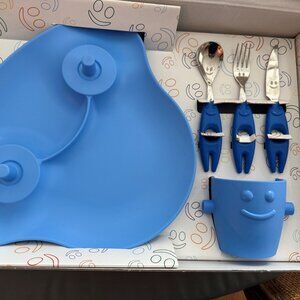 Trebimbi Party 5-piece feeding gift set. Color is Blue. Designed in Italy. Keep the little ones entertained during dinner time with this fun, high quality set of children's feeding items. Stainless steel fork, knife and spoon feature faces on the blades. Each piece of the set clicks together for easy storage and adds an element of fun for children. Set contains: 1 knife, 1 fork, 1 spoon, 1 plate, and 1 mug. Brand new. Dishwasher safe.