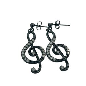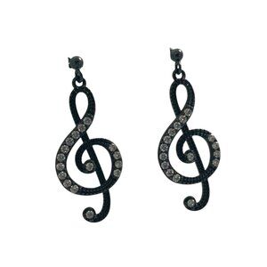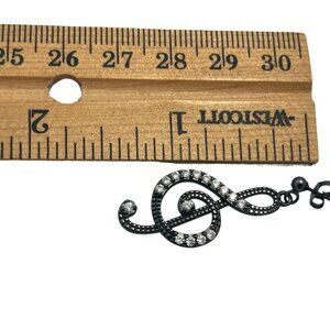 Treble Clef Earrings Music Note Black Metal Rhinestones Artistic Teacher Gift in good preowned condition. Measures about 1.5".
