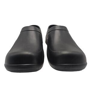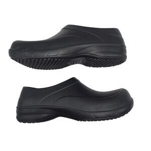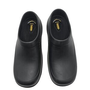 This is a pair of NEW WITHOUT TAGS work shoes in the professional clog style from TredSafe. TredSafe shoes are oil and slip-resistant, non-marking, waterproof, and washable. They are great when you have to be on your feet for long shifts, or even for working outside in the garden. These shoes are designed to be UNISEX and fit Men's Size 10 or Women's Size 11.