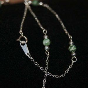 This unique necklace is made with tree agate beads in dark green & white. They graduate in size to form the bib in the front, as well as the little accent beads along the chain. The chain is made of sterling silver, as well as the ball accent beads and catch, which is a spring closure for ease of fastening. Total length of necklace is approximately 19 inches long. The longest spike on the necklace measures a length of just over an inch long. This necklace would be perfect for the nature lover!