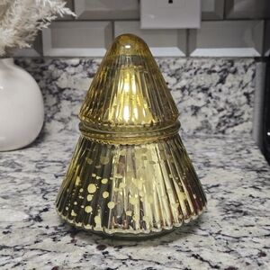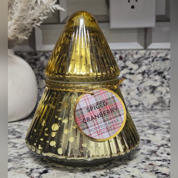 Enjoy the warm and inviting aroma of the Spiced Cranberry Scented Candle. Encased in a stylish gold Christmas tree shaped container, this candle adds a touch of elegance to any room. New!