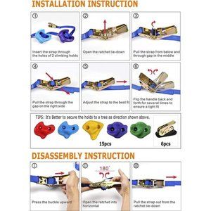 Use these climbers as easy access to a tree fort, or for just plain climbing fun! Simple to set up, the straps wrap around tree trunks, catch on the bark, and lock into place with crank clips. Get kids excited about getting outside and playing. This is backyard fun at its best! Adult supervision and installation required. Max. weight: 200 lbs. Set includes: 15 x 5 colores and 4 shaped heavy duty climbing holds/steps 6 x study 6.5ft ratchet straps Features -Move closer together for smaller children or further apart for older children or adults. -Excellent to use with award-winning ninja line: climb the tree and transition over to the ninja line which is the super popular monkey bar obstacle course kit. -Specially designed base plates -will not hurt trees!