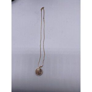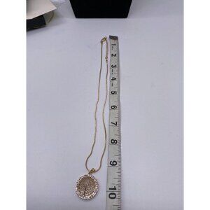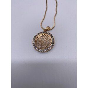 Gold-plated women's necklace featuring a dazzling cubic zirconia rhinestone border and a Tree of Life round pendant design. Perfectly crafted for an elegant accessory option.