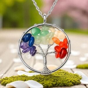 Tree of Life necklace, colorful pendant, natural stones, chakra healing, gemstone jewelry, handmade jewelry, energy balance, boho necklace, spiritual necklace, crystal healing, silver chain, artisan crafted, healing crystals, bohemian fashion, tree of life pendant, unique gift, metaphysical jewelry, wire-wrapped pendant, natural gemstone pendant, chakra balancing, holistic healing jewelry, handcrafted necklace, multi-stone pendant, boho chic, spiritual gift, gemstone necklace, vibrant stones, energy crystal necklace, Tree of Life jewelry, gemstone tree pendant, rainbow crystal pendant, handmade chakra necklace, natural stone jewelry, yoga jewelry, healing stone necklace, reiki jewelry, energy stone pendant, meditation jewelry, spiritual healing necklace, bohemian style pendant, multicolor