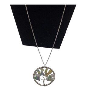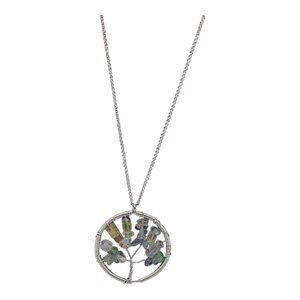 This elegant Tree of Life necklace features natural gemstone chips and a silver-tone chain. A sophisticated accessory for timeless style.