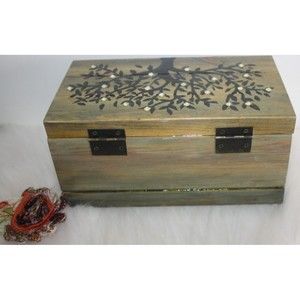 Homemade Tree of Life wood memory box. Stained wood eith rhinestone embellishments on top. Approximately 8"X4"X4 1/2". Very good pre-owned condition.