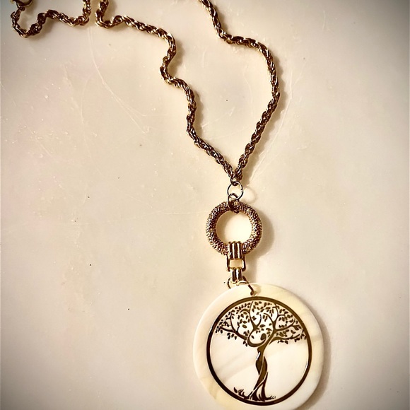 Introducing our exquisite handcrafted Tree of Life pendant necklace, a symbol of connection to all life, love, and eternity. The intricate design showcases a beautifully detailed woman shaped into a tree set against a pristine ivory colored shell backdrop, encased in a golden circular frame. Suspended from an elegant chain, this piece is not just jewelry but a work of art that adds sophistication and meaning to every outfit. The pendant features the design of the "Tree of Life" with detailed branches and roots. - It is circular in shape with an ivory-colored background and the tree design in gold. - Above the pendant is another smaller circular element adorned with details that connect it to the chain. - The chain is made up of intricate links showcasing quality craftsmanship. - The overall color scheme consists of gold and ivory tones giving it an elegant look.