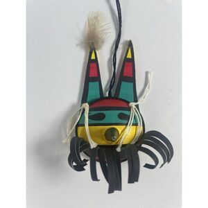 Tree Spirits Wasp Kachina Ornament signed by Sherry Brown. There is a flaw- one is the ears is missing its feather, see picture. Measures approximately 3.
