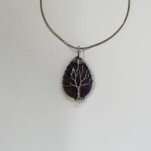 This Tree of Life amethyst pendant necklace is a stunning piece of handcrafted jewelry that carries both beauty and symbolic meaning. The pendant features a polished teardrop-shaped amethyst gemstone, wrapped with silver-tone wire in the shape of a detailed Tree of Life. Known as a stone of peace, balance, and spiritual growth, amethyst brings a calming energy, while the Tree of Life symbolizes strength, grounding, and connection. The pendant measures approximately 2 inches long, making it a striking focal point, while the chain measures about 18 inches for comfortable everyday wear. The silver-tone snake chain is lightweight, elegant, and easy to style with both casual and dressy outfits. This necklace makes a meaningful gift for birthdays or anyone who appreciates gemstone jewelry and symbolic designs. A thoughtful piece for crystal lovers, it combines natural beauty with timeless artistry. Add this Tree of Life amethyst pendant to your collection for inspiration and balance.