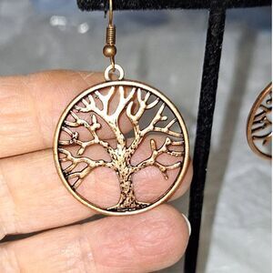 This is a pair of copper colored pierced earrings representing the tree of life. These are lightweight, on a wire hook and 2" long. The tree of life is about rebirth and growth and these earrings symbolize that. They are in nice pre-owned condition.