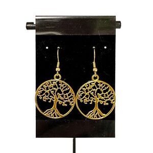 HANDCRAFTED -- two-sided gold-tone tree of life charms dangle 1 3/4" from gold-plated french hook ear wires for pierced ears. The circle charms are about 1" across. Perfect as a gift for her or to gift yourself. Brand new, never worn. Excellent condition.