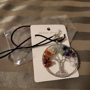 This Tree of Life Gemstone Silver tone Setting/Chain is in its original, unopened package. The pendant is on a black leather cord with a silver tone clasp and dangle chain.