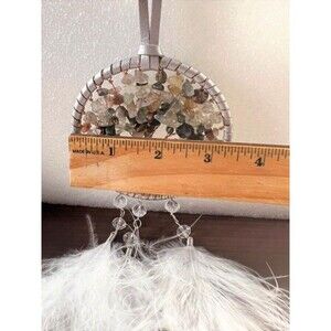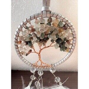 Very pretty Tree of Life Hanging. Mixed gemstones with 3 feathers hanging from circle. Total length is approx. 16 inches. Circle is approx. 3 1/2 inches.