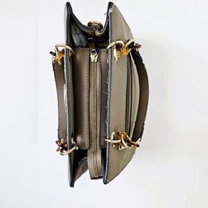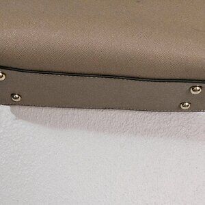 Tree of Life Stylish Casual Taupe Handbag. 10"L X 8"" deep X 5".. Features double straps held with acrylic and gold metal hardware, Tree of Life Emblem accents one side while a zippered pocket functions on the other side. The strap that makes it a crossbody bag, is missing. Other wise, it is in very condition. suitable for casual wear, work, or every day life activities.